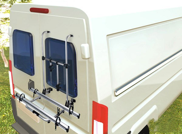 自行式房車一般只能裝到后面,值得注意的是車身后面的安裝位置是否會(huì)與其它裝備有所干涉。通常出于安全考慮,自行車架都是裝到后側(cè)中間位置,如果后側(cè)有左右門或爬梯,那么只能選擇在右側(cè)安裝的自行車架,如果后側(cè)無門也無爬梯,那么要考慮后側(cè)是否有窗戶,若沒有窗戶,則可以選擇安裝桿較長(zhǎng)的自行車架。